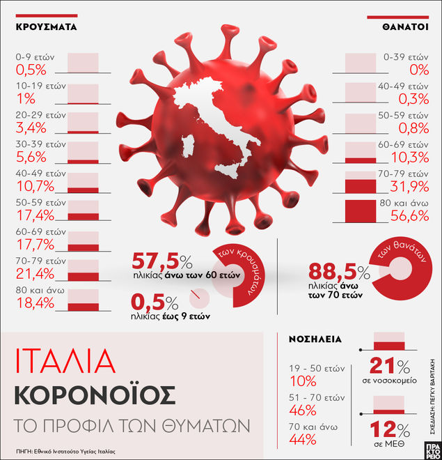Ένα γράφημα από το Αθηναϊκό Πρακτορείο Ειδήσεων βασισμένο σε στοιχεία του Εθνικού Ινστιτούτου Υγείας της Ιταλίας απεικονίζει τη σοβαρότητα της κατάστασης στη γειτονική χώρα και προειδοποιεί για εγρήγορση, έγκαιρη πρόληψη και παραμονή στο σπίτι.