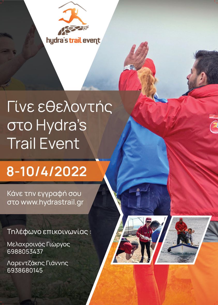 Την Παρασκευή 11/03 στις 18.00 στην αίθουσα Δημοτικού Συμβουλίου (πρώην κτήριο ΟΤΕ) θα πραγματοποιηθεί η 1η συνάντηση Εθελοντών του Hydra's Trail Event 2022, στην οποία θα γίνει η παρουσίαση των φετινών αγώνων και χορηγών!