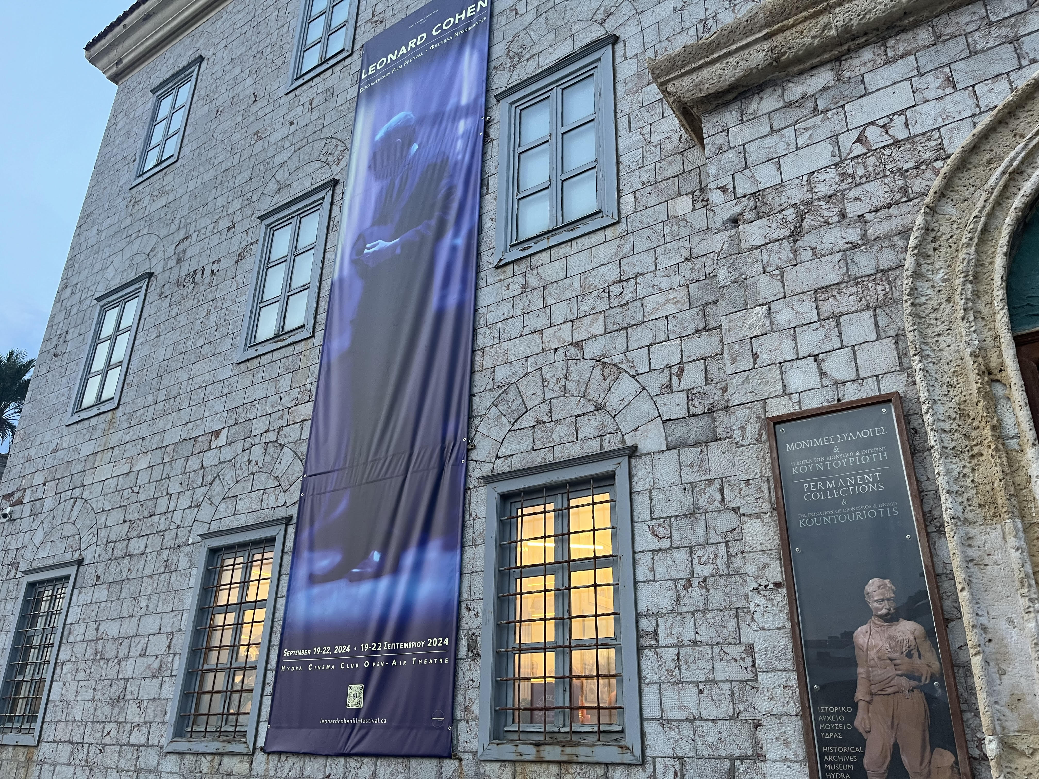 Το Ιστορικό Αρχείο Μουσείο Ύδρας, με ένα εντυπωσιακό banner του φεστιβάλ και του Κοέν, συνέβαλε στη δημιουργία μιας ατμόσφαιρας που συγκίνησε τους παρευρισκόμενους.