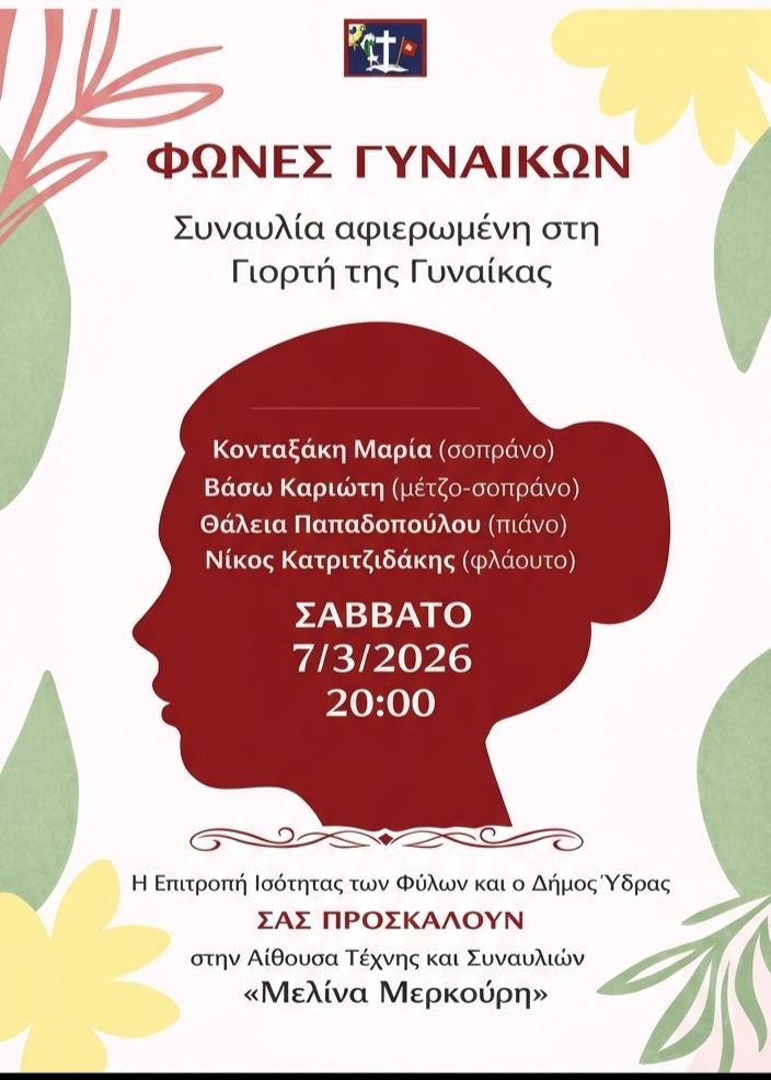 Η Επιτροπή Ισότητας των Φύλων και ο Δήμος Ύδρας σας προσκαλούν το Σάββατο 7 Μαρτίου 2026 και ώρα 20:00, στην Αίθουσα Τέχνης και Συναυλιών «Μελίνα Μερκούρη», σε μια ξεχωριστή συναυλία αφιερωμένη στη Γιορτή της Γυναίκας.