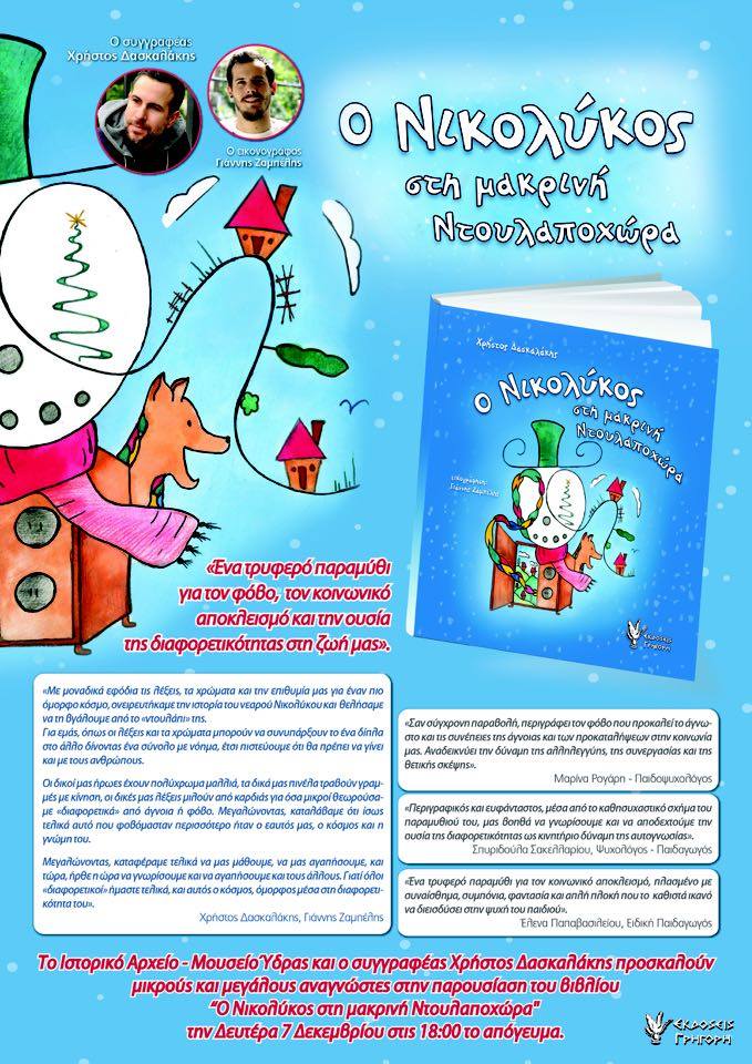 Την παρουσίαση του ολοκαίνουριου παραμυθιού του, θα κάνει στην Ύδρα ο Χρήστος Δασκαλάκης στις 7 Δεκεμβρίου. Το Ιστορικό Αρχείο - Μουσείο Ύδρας θα ανοίξει τις πύλες του για να υποδεχτεί μικρούς και μεγάλους αναγνώστες που μαζί με τον συγγραφέα και τον Νικολύκο θα ταξιδέψουν λίγες μέρες πριν τα Χριστούγεννα στη μακρινή Ντουλαποχώρα!