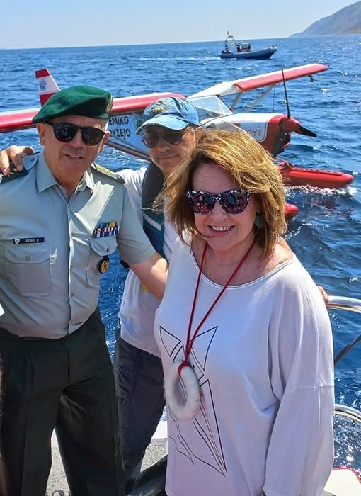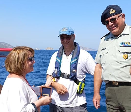 Πάνω σε πλωτό σκάφος, πραγματοποιήθηκε η απονομή αναμνηστικών, τιμής ένεκεν, στον πιλότο Κωνσταντίνο Δροσίδη που πραγματοποίησε με επιτυχία την πτήση, αναβιώνοντας το ταξίδι του Δημητρίου Καμπέρου στη γενέτειρά του.