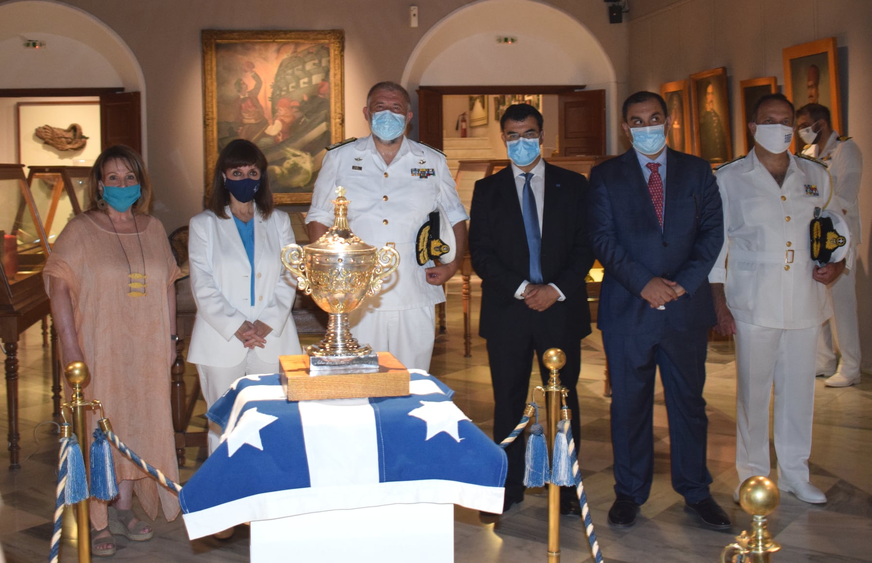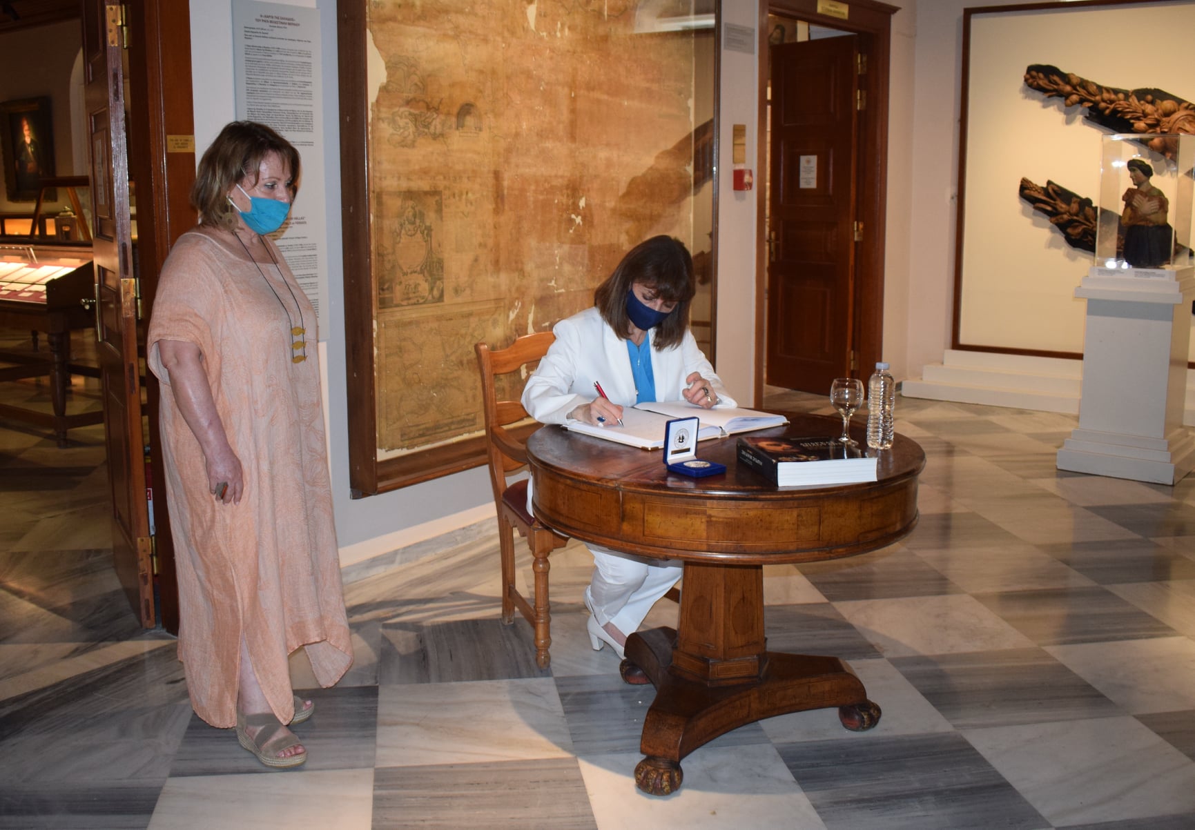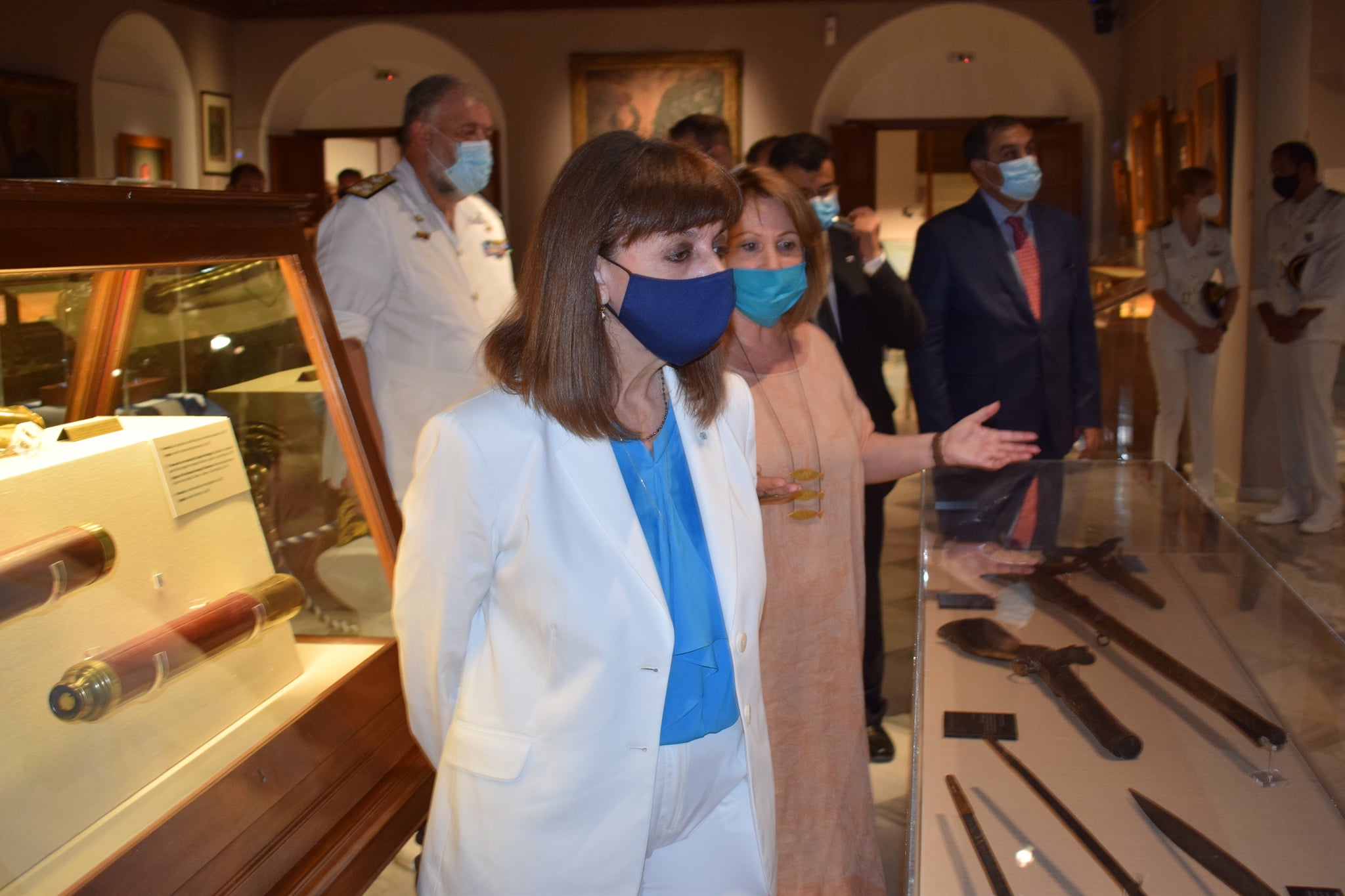 Στο τέλος της ξενάγησης, η Διευθύντρια του Ι.Α.Μ.Υ. προσέφερε τιμής ένεκεν στην Πρόεδρο της Δημοκρατίας το αναμνηστικό μετάλλιο για τα 200 χρόνια από την Ελληνική Επανάσταση και τη βραβευμένη ιστορική μονογραφία «Ανδρέας Μιαούλης, από την υπόδουλη ως την ελεύθερη Ελλάδα» που έχει συγγράψει με την Αννίτα Πρασσά.