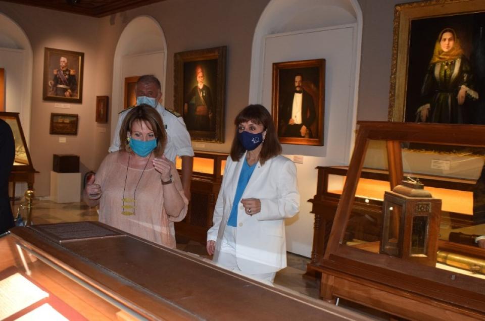 Η Κυρία Πρόεδρος περιηγήθηκε το Μουσείο και έδειξε ιδιαίτερο ενδιαφέρον για τα μουσειακά εκθέματα. Στάθηκε στις προθήκες που εκτίθενται ιστορικά τεκμήρια, επιστολές Αγωνιστών του 1821, και θαύμασε τις προσωπογραφίες, ενώ εντυπωσιάστηκε από τη Μεγάλη Χάρτα του Ρήγα.