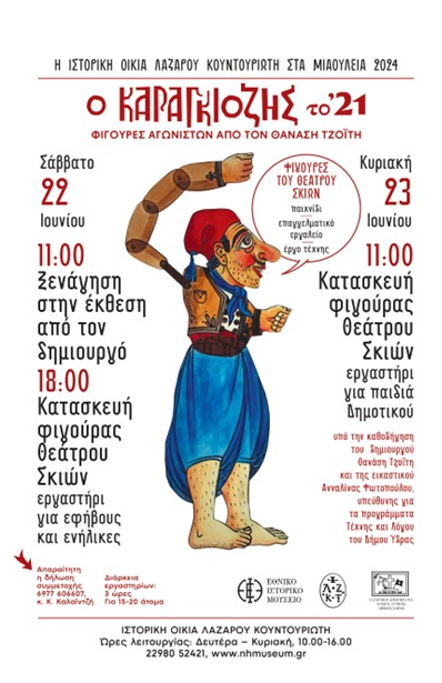 Ξεναγήσεις και εργαστήρια τέχνης για παιδιά και ενήλικες. Στο πλαίσιο της έκθεσης «Ο Καραγκιόζης το '21. Φιγούρες αγωνιστών του Θανάση Τζοΐτη», το Εθνικό Ιστορικό Μουσείο σε συνεργασία με τον Δήμο Ύδρας οργανώνει στην Ιστορική Οικία Λαζάρου Κουντουριώτη τις εξής δράσεις: Σάββατο 22 Ιουνίου 2024 στις 11:00: Ξενάγηση στην περιοδική έκθεση από τον δημιουργό Θανάση Τζοΐτη. Σάββατο 22 Ιουνίου 2024 στις 18:00: Εργαστήριο για ενήλικες «Φιγούρες του Θεάτρου Σκιών: παιχνίδι - επαγγελματικό εργαλείο – έργο τέχνης». Έφηβοι και ενήλικες επισκέπτες θα κατασκευάσουν μια φιγούρα του Θεάτρου Σκιών ακολουθώντας τα βήματα των επαγγελματιών με τη χρήση αντίστοιχων υλικών υπό την καθοδήγηση του δημιουργού, Θανάση Τζοΐτη, και της εικαστικού Ανναλίνας Φωτοπούλου, υπεύθυνης για τα προγράμματα Τέχνης και Λόγου του Δήμου Ύδρας. Κυριακή 23 Ιουνίου 2024 στις 11:00: Εργαστήριο για παιδιά «Φιγούρες του Θεάτρου Σκιών: παιχνίδι - επαγγελματικό εργαλείο – έργο τέχνης». Αντίστοιχο εργαστήρι για παιδιά Δημοτικού με τον Θανάση Τζοΐτη και την Ανναλίνα Φωτοπούλου. Η φιγούρα θα διαμορφωθεί σε χαρτόνι και υλικά που χρησιμοποιούνται από τους μικρούς μας φίλους. Διάρκεια εργαστηρίων: 3 ώρες Για 15-20 άτομα Απαραίτητη η δήλωση συμμετοχής: Κ. Καλαϊντζή: 6977606607 Ιστορική Οικία Λαζάρου Κουντουριώτη - Ύδρα Ώρες λειτουργίας: Δευτέρα – Κυριακή, 10:00-16:00 Τηλέφωνο επικοινωνίας: 22980 52421 |