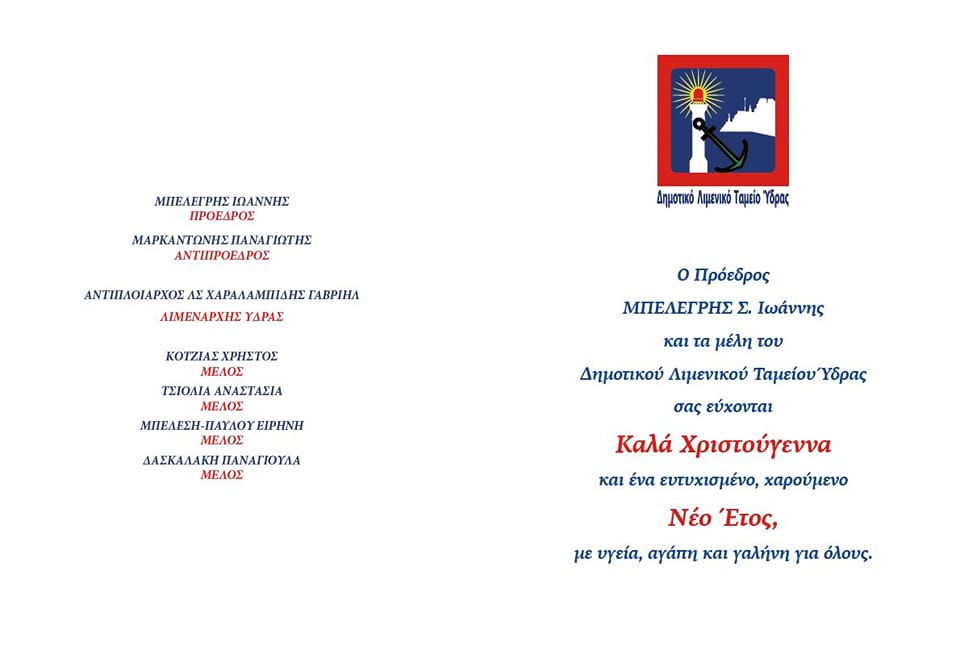 Τις ευχές του στέλνει με την παρακάτω κάρτα το Δημοτικό Λιμενικό Ταμείο Ύδρας, o Πρόεδρος Γιάννης Μπελεγρής και τα μέλη του ΔΛΤΥ.