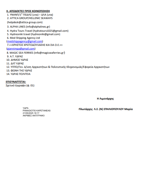 Οι ακτοπλοϊκές εταιρείες και οι ναυτικοί πράκτορες αυτών προς τους οποίους κοινοποιείται το παρόν παρακαλούνται όπως προβούν σε κατάλληλη ενημέρωση των πληρωμάτων των πλοίων που έχουν ακτοπλοϊκή σύνδεση με τη νήσο Ύδρα, προκειμένου να ενημερώνουν σχετικά τους επιβάτες των πλοίων.