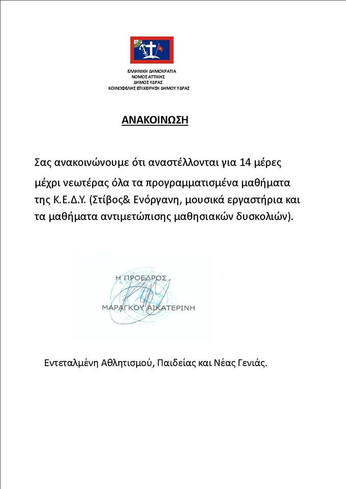 H Πρόεδρος της Κοινωφελούς Επιχείρησης του Δήμου Ύδρας και εντεταλμένη Αθλητισμού, Παιδείας και Νέας Γενιάς, Κατερίνα Μαραγκού ενημερώνει ότι αναστέλλονται για 14 μέρες και μέχρι νεωτέρας όλα τα προγραμματισμένα μαθήματα της ΚΕΔΥ.