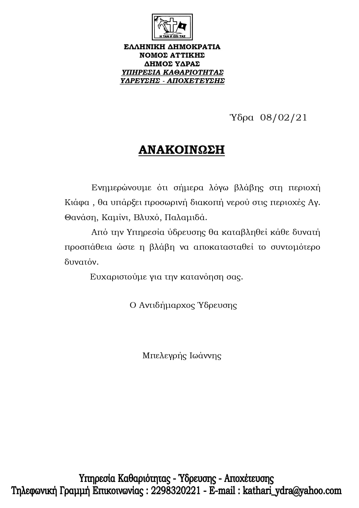 Από την Υπηρεσία ύδρευσης καταβάλλεται κάθε δυνατή προσπάθεια ώστε η βλάβη να αποκατασταθεί το συντομότερο δυνατό.