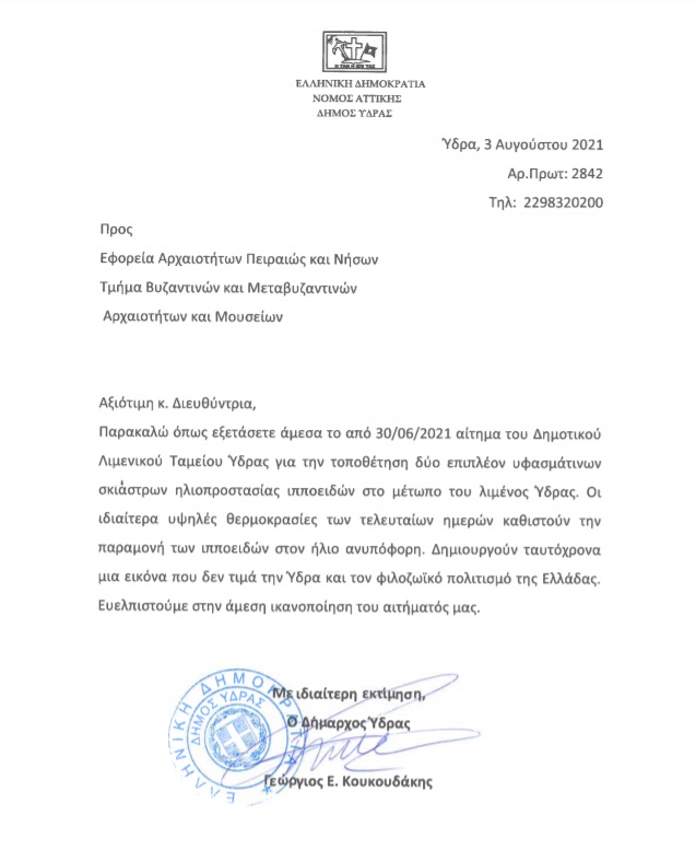 Επιστολή προς την Εφορεία Αρχαιοτήτων Πειραιώς και Νήσων έστειλε ο Δήμαρχος Ύδρας Γιώργος Κουκουδάκης ζητώντας την άμεση εξέταση του πρόσφατου αιτήματος του Δημοτικού Λιμενικού Ταμείου Ύδρας για την τοποθέτηση 2 επιπλέον υφασμάτινων σκιάστρων ηλιοπροστασίας για τα ιπποειδή στο μέτωπο του λιμανιού.