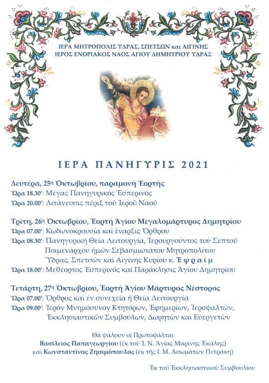 Το πρόγραμμα των εορταστικών εκδηλώσεων της ενορίας του Ιερού Ναού του Αγίου Δημητρίου Ύδρας ξεκινά την Δευτέρα 25 Οκτωβρίου.