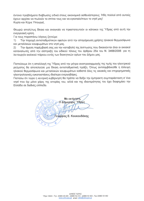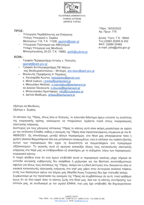Στην επιστολή αναφέρεται στις συνέπειες της ενεργειακής κρίσης για τους κατοίκους της Ύδρας και τα τεράστια ποσά που καλούνται να πληρώσουν στους λογαριασμούς ηλεκτρικής ενέργειας.