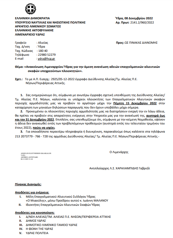 Ανακοίνωση εξέδωσε το Λιμεναρχείο Ύδρας και ο Λιμενάρχης Αντιπλοίαρχος Λ.Σ. Γαβριήλ Χαραλαμπίδης σχετικά με την άμεση ανανέωση αδειών επαγγελματικών αλιευτικών σκαφών υποχρεούντων πλοιοκτητών.