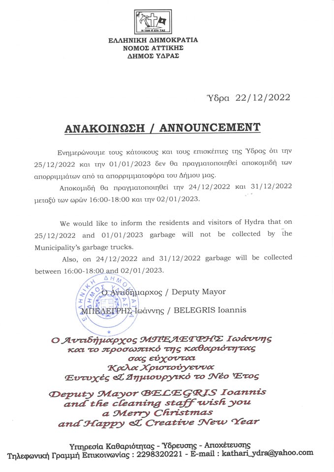 Την Κυριακή 25 Δεκεμβρίου και την Κυριακή 1 Ιανουαρίου 2023 δεν θα πραγματοποιηθεί αποκομιδή των απορριμμάτων από τα απορριματοφόρα του Δήμου Ύδρας.