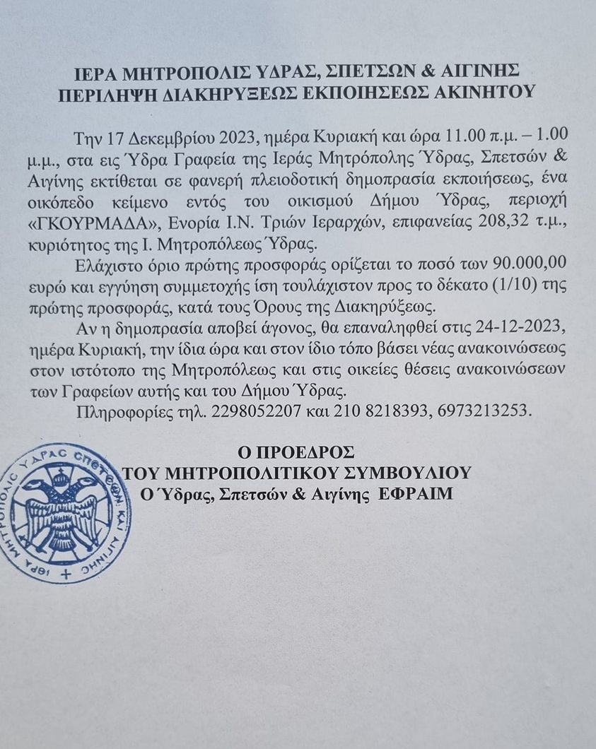 Δημοπρασία Ι. Μητρόπολης Ύδρας, Σπετσών και Αιγίνης για την εκποίηση ενός οικοπέδου στην περιοχή "Γκουρμάδα".
