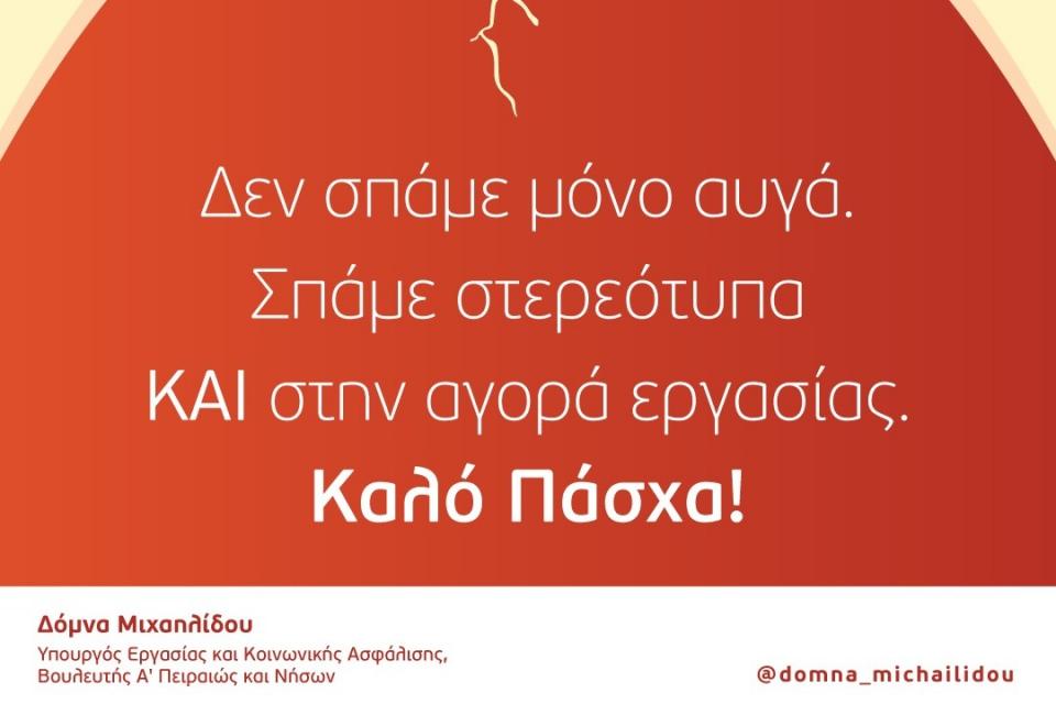 Ευχές για το Πάσχα από την Υπουργό Εργασίας και Κοινωνικής Ασφάλισης Δόμνα Μιχαηλίδου