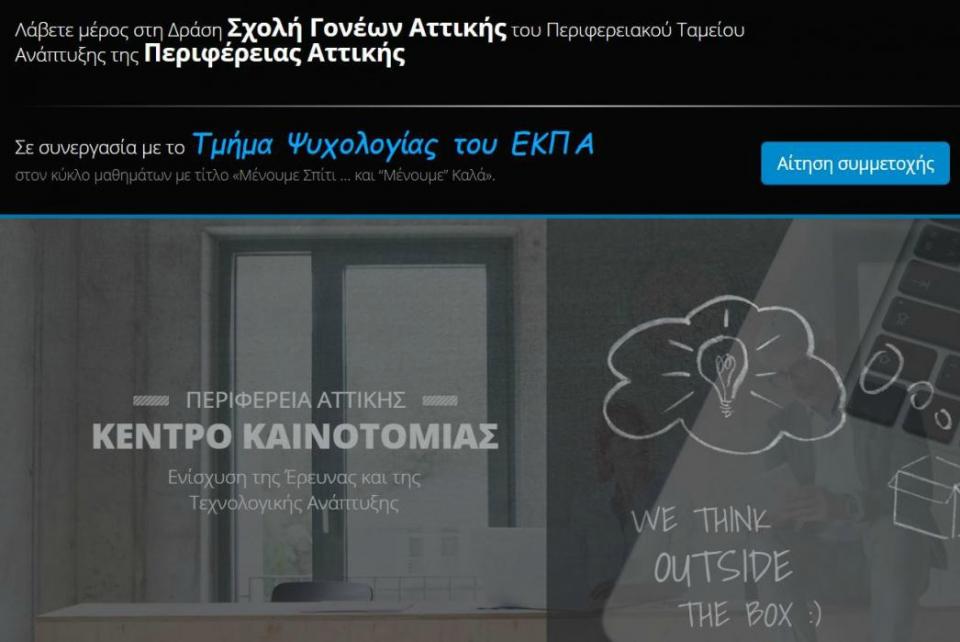 Ξεκινά αύριο, 23 Απριλίου και θα διαρκέσει μέχρι και 29 Απριλίου 2020 η διαδικασία κατάθεσης στην ηλεκτρονική πλατφόρμα http://www.innovationattica.gr/aitisi των δηλώσεων ενδιαφέροντος για συμμετοχή στον κύκλο εξ’ αποστάσεως Μαθημάτων με τίτλο «Μένουμε Σπίτι… και μένουμε καλά» της «Σχολής Γονέων Αττικής» που διοργανώνει η Περιφέρεια Αττικής σε συνεργασία με το Εθνικό και Καποδιστριακό Πανεπιστήμιο Αθηνών – Τμήμα Ψυχολογίας.