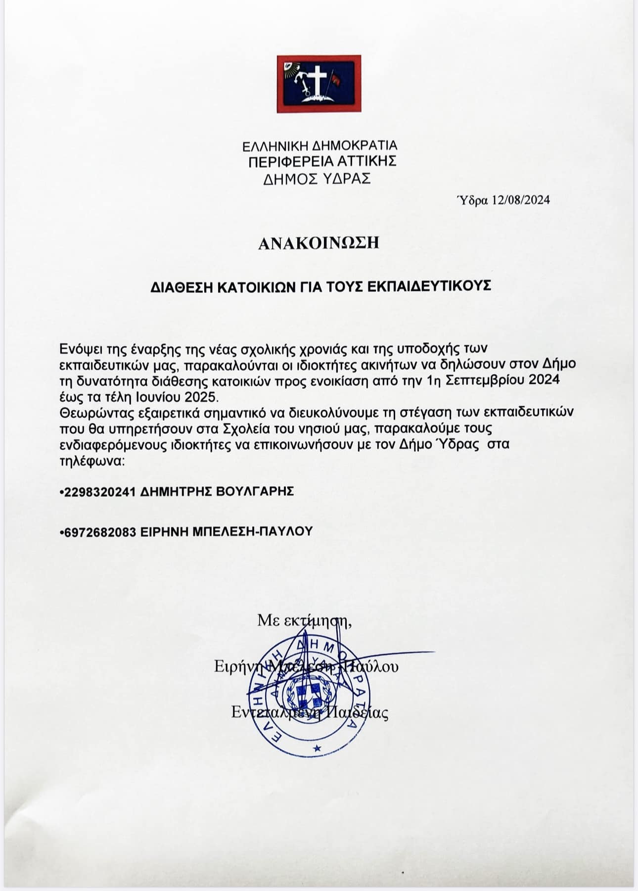 Ο Δήμος Ύδρας με την παρακάτω ανακοίνωσή του καλεί τους ιδιοκτήτες να δηλώσουν τη δυνατότητα διάθεσης κατοικιών προς ενοικίαση από την 1η Σεπτεμβρίου 2024 έως τα τέλη Ιουνίου 2025, για τη στέγαση των εκπαιδευτικών που θα υπηρετήσουν στα σχολεία του νησιού μας.