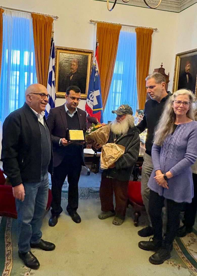 Τρίτον: Η Πρόεδρος του φορέα του Ιστορικού Αρχείου – Μουσείου Ύδρας του επέδωσε ένα αναμνηστικό κεραμεικό με τα ελληνικά χρώματα, τιμώντας και ευχαριστώντας τον με την κίνησή της αυτή, για τη διαχρονική προσφορά του στα ιστορικά και πολιτιστικά δρώμενα του Νησιού μας.