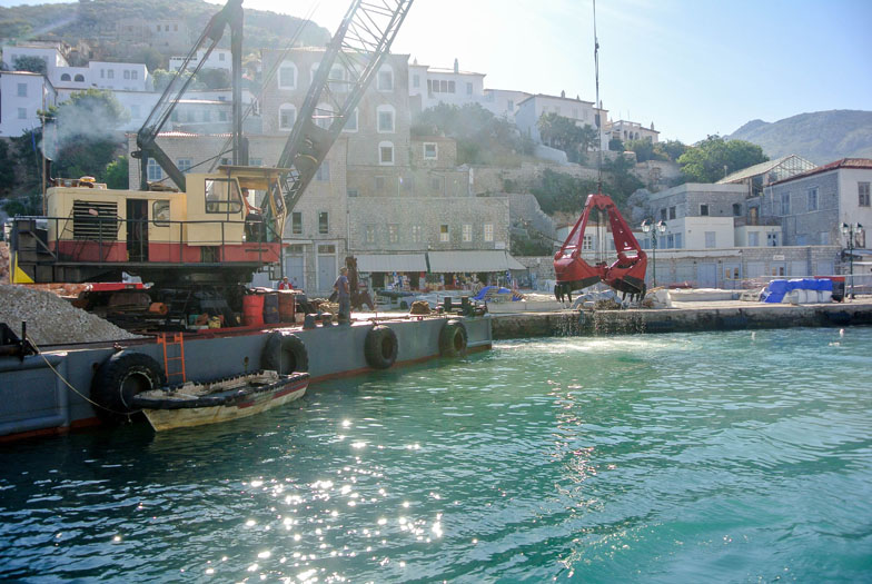 Συνεχίζεται το επισκευαστικό έργο αποκατάστασης κρηπιδώματος στο σημείο που δένουν τα καράβια στο λιμάνι της Ύδρας.