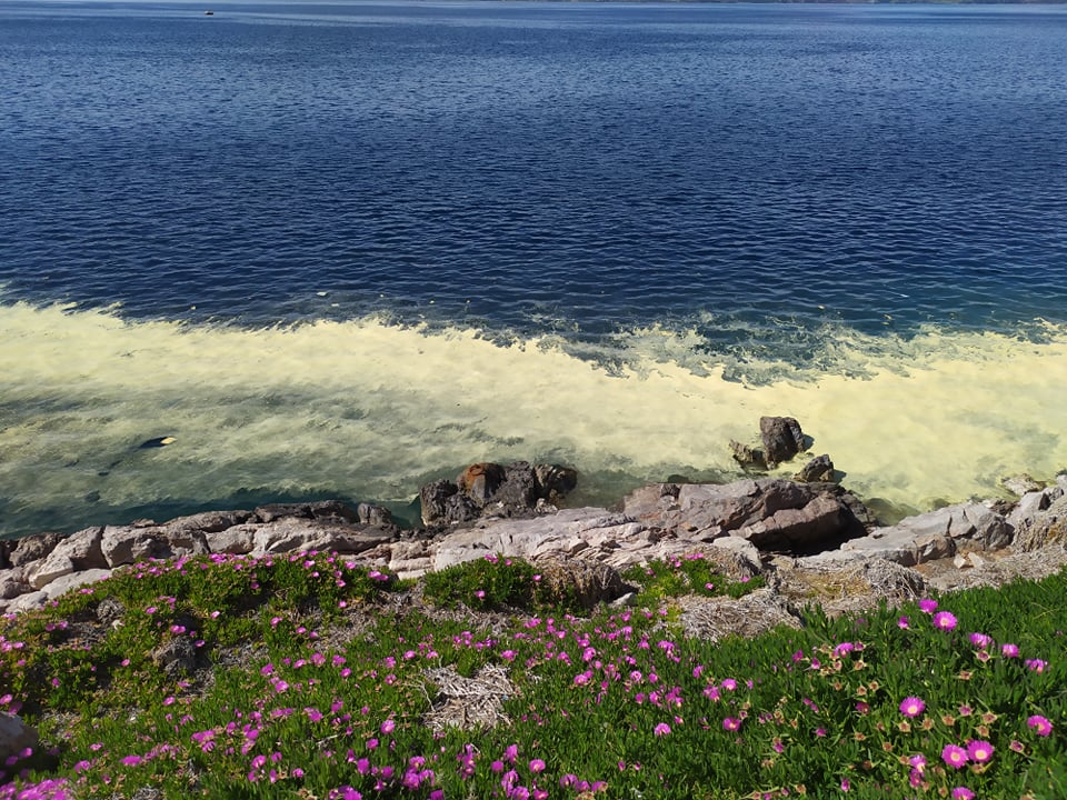 Η γύρη επιπλέει στην θάλασσα όπως συμβαίνει την εποχή αυτή, απλά είναι εκτεταμένη αυτή την φορά λόγω της άπνοιας και για τον λόγο αυτό δεν διαλύεται εύκολα.