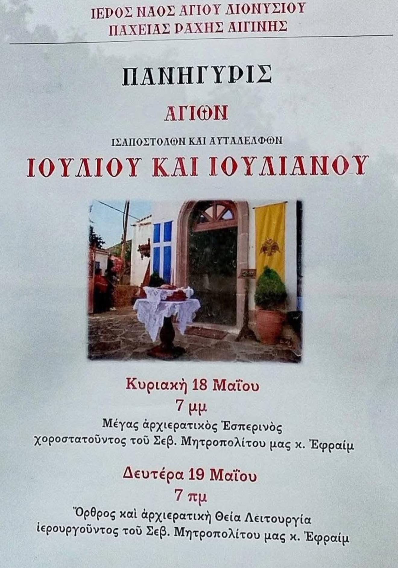 εις την Θ. Λειτουργία επι τη εορτή της συνάξεως των Αιγινητών Αυταδελφων Ιεραποστολών Ιουλίου και Ιουλιανού εις τον Ι. Ναό του Αγίου Διονυσίου χωριού Παχείας Ράχης - Αιγίνης.