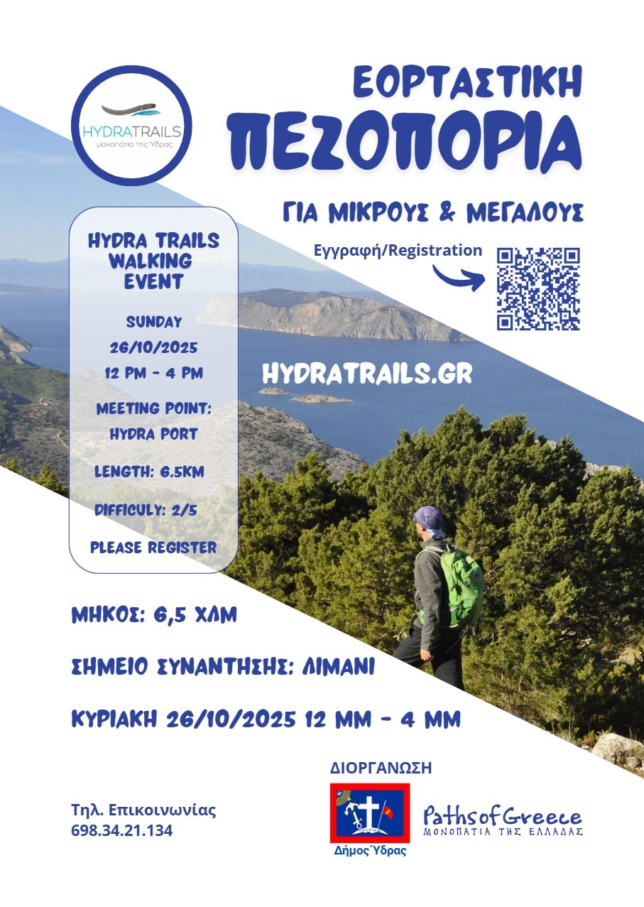 Ο Δήμος Ύδρας σε συνεργασία με την Μονοπάτια της Ελλάδας - Paths of Greece, προσκαλεί σε μια ξεχωριστή πεζοπορία την Κυριακή 26 Οκτωβρίου, στα υπέροχα μονοπάτια του Νησιού μας!