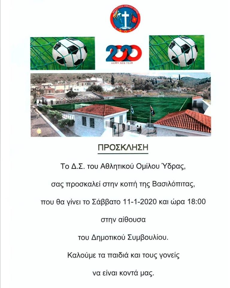 Ο Αθλητικός Όμιλος Ύδρας θα πραγματοποιήσει κοπή βασιλόπιτας το Σάββατο 11 Ιανουαρίου 2020 και ώρα 18:00 στην αίθουσα Δημοτικού Συμβουλίου Ύδρας.