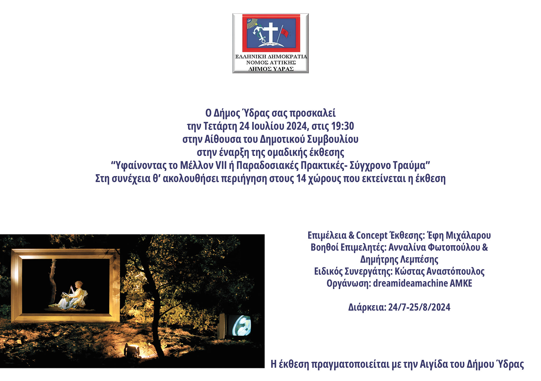 Ο Δήμος Ύδρας σας προσκαλεί την Τετάρτη 24 Ιουλίου 2024, στις 19:30, στην Αίθουσα του Δημοτικού Συμβουλίου, στην έναρξη της ομαδικής έκθεσης ‘’Υφαίνοντας το Μέλλον VII ή Παραδοσιακές Πρακτικές- Σύγχρονο Τραύμα’’ και στη συνέχεια θ’ ακολουθήσει περιήγηση στους 15 χώρους που εκτείνεται η έκθεση.
