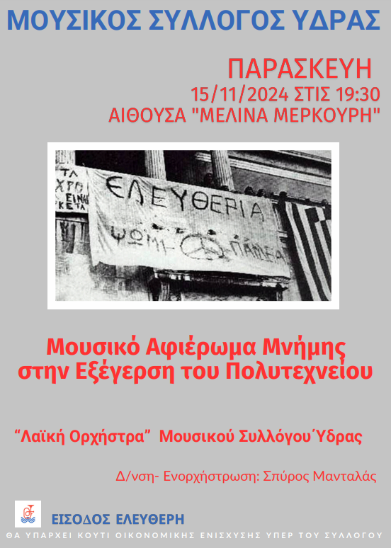 Την Παρασκευή 15 Νοεμβρίου στις 19:30, στην αίθουσα "Μελίνα Μερκούρη", θα πραγματοποιηθεί μουσικό αφιέρωμα μνήμης, από τη "Λαϊκή Ορχήστρα" του Μουσικού Συλλόγου Ύδρας, με τραγούδια σπουδαίων δημιουργών που συνδέθηκαν με την εξέγερση του Πολυτεχνείου.