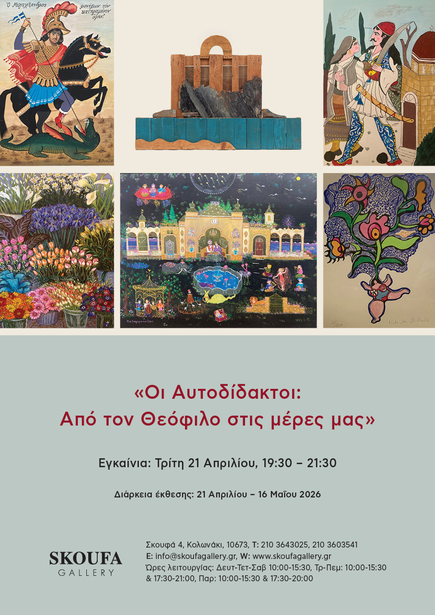 Η Γκαλερί Σκουφά με Χαρά παρουσιάζει την καινούργια ομαδική έκθεση με τίτλο «Οι Αυτοδίδακτοι: Από τον Θεόφιλο στις μέρες μας». Η έκθεση εγκαινιάζεται την Τρίτη 21 Απριλίου, στις 19:30 – 21:30 και θα διαρκέσει μέχρι τις 16 Μαΐου 2026.