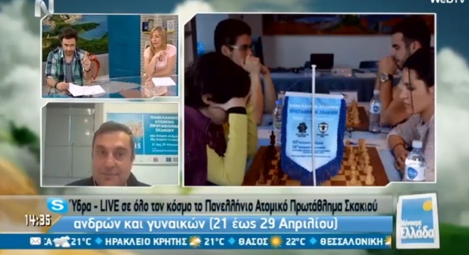 Ο Πρόεδρος του Σκακιστικού Ομίλου Ύδρας, Κώστας Αγγελόπουλος μίλησε για τη διαξαγωγή των Πρωταθλημάτων στο νησί μας, έδωσε πληροφορίες για την εξέλιξη των αγώνων και μέσω της εκπομπής έκανε κάλεσμα σε όλους, Υδραίους και μη, που ζουν στην Ύδρα, που γνωρίζουν και θέλουν να παίξουν σκάκι, ώστε να συμμετάσχουν σε σιμουλτανέ (αγώνα επίδειξης) που διοργανώνει ο Σκακιστικός Όμιλος Ύδρας με τον γκρανμετρ Θάνο Μαστροβασίλη μετά την τελετή λήξης που θα γίνει στις 29 Απριλίου, ημέρα Τετάρτη και ώρα 16:00 στο Ιστορικό Αρχείο-Μουσείο Ύδρας.