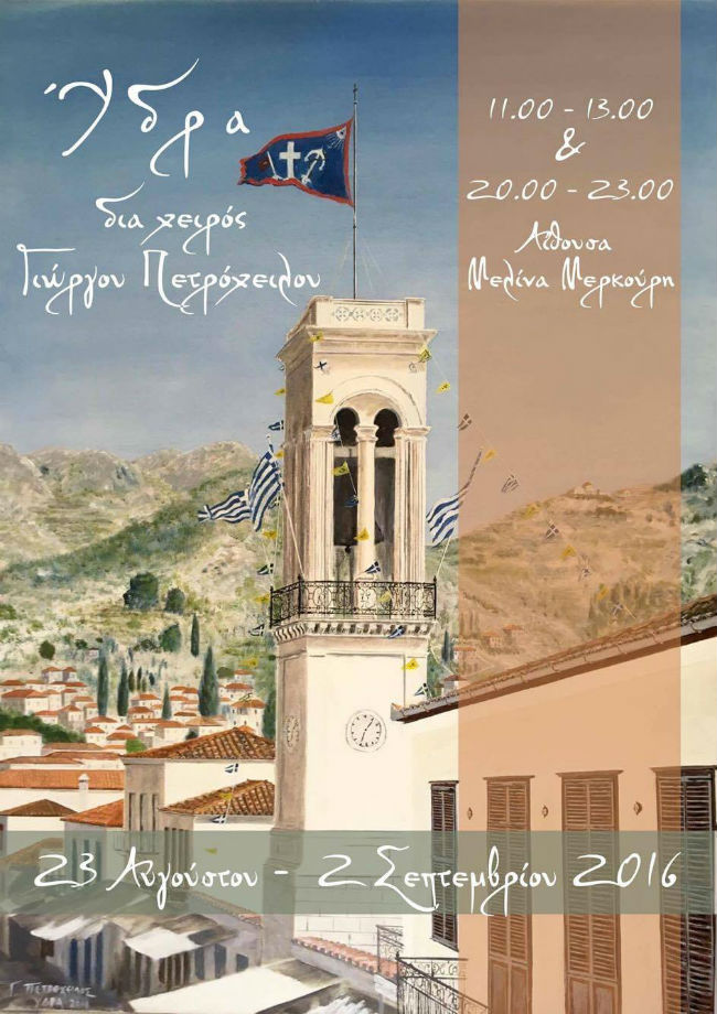 Η έκθεση «Ύδρα διά χειρός Γιώργου Πετρόχειλου» θα διαρκέσει μέχρι τις 2 Σεπτεμβρίου 2016. Ώρες κοινού: 11.00-13.00 & 20.00-23.00.