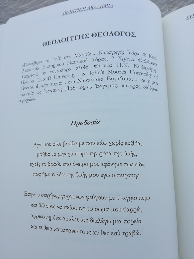 Μια σημαντική διάκριση για τον Υδραίο Πλοίαρχο Ε.Ν. και παράγοντα της Ναυτιλίας Θεολόγο Ιωάννη Θεολογίτη αποτελεί η συμμετοχή του στην ΠΟΙΗΤΙΚΗ ΑΚΑΔΗΜΙΑ, Σύγχρονη ανθολογία της νέας ελληνικής ποίησης σε επιμέλεια του Δημήτρη Ιατρόπουλου.
