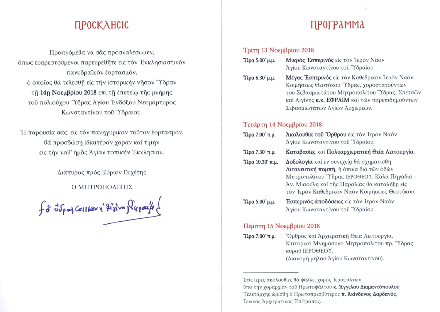 ΠΡΟΣΚΛΗΣΗ ΤΗΣ ΙΕΡΑΣ ΜΗΤΡΟΠΟΛΕΩΣ ΥΔΡΑΣ, ΣΠΕΤΣΩΝ ΚΑΙ ΑΙΓΙΝΗΣ
