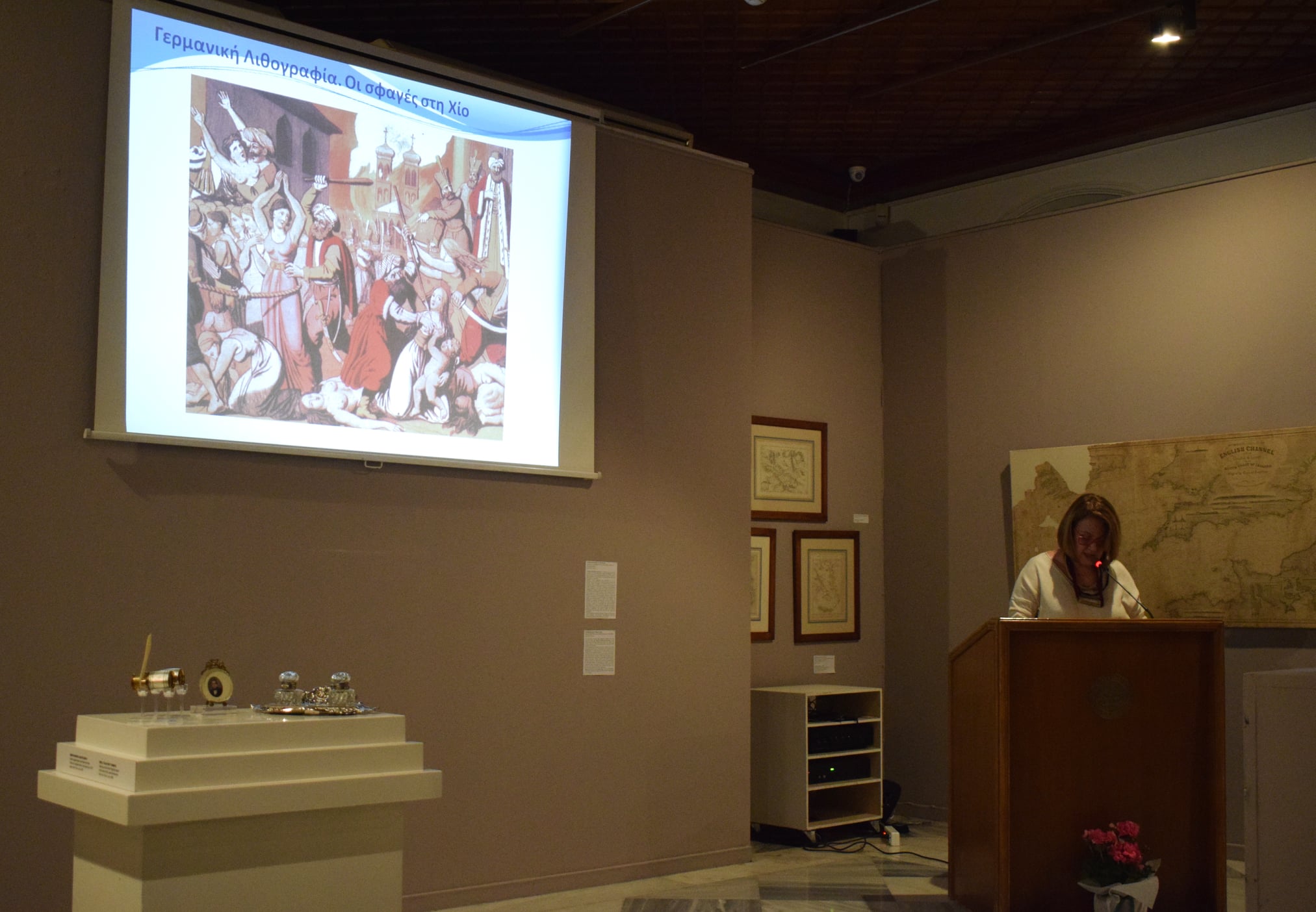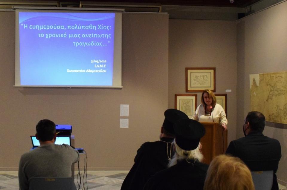 Ομιλήτρια της εκδήλωσης ήταν η Διευθύντρια του Ι. Α. Μ. Υ. Ντίνα Αδαμοπούλου, η οποία ανέπτυξε το θέμα «Η ευημερούσα και πολύπαθη Χίος: το χρονικό μιας ανείπωτης τραγωδίας…», παρουσία πολυπληθούς και εκλεκτού ακροατηρίου.
