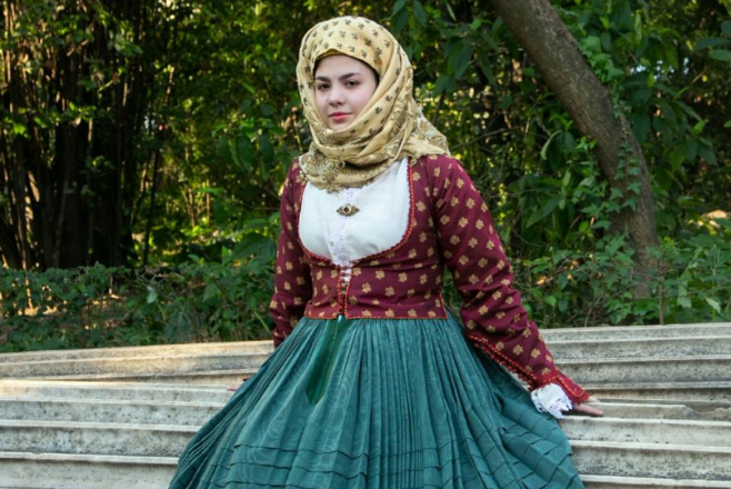 Η φορεσιά που παρουσιάζεται είναι γιορτινή, με χαρακτηριστικό το μεταξωτό πουκάμισο με μπιμπίλες, το πολύπτυχο μεταξωτό φουστάνι, την εφαρμοστή μεταξωτή τζάκα (γιλέκο), το ολομέταξο μαντίλι με τα λεπτοδουλεμένα πολύχρωμα μεταξοκεντήματα από χρυσό. Το μαντίλι είναι αυθεντικό και ανήκει στην οικογένεια Κοτομμάτη - Σκουλή.