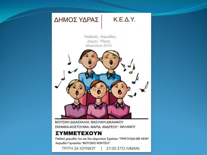 Την Τρίτη 24 Ιουνίου 2014 και ώρα 21:00 στο πλαίσιο των Μιαουλείων ένα μουσικό ταξίδι από τα τμήματα χορωδίας του Δήμου Ύδρας (Κ.Ε.Δ.Υ) στο λιμάνι.