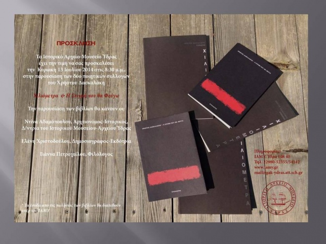 Την Κυριακή 13 Ιουλίου 2014 και ώρα 20:30 θα πραγματοποιηθεί στο Ιστορικό-Αρχείο Μουσείο Ύδρας η παρουσίαση των βιβλίων «Τη στιγμή που θα φεύγω» και «Χιλιόμετρα», του Χρήστου Δασκαλάκη, τα οποία κυκλοφορούν από τις εκδόσεις «Στοχαστής».