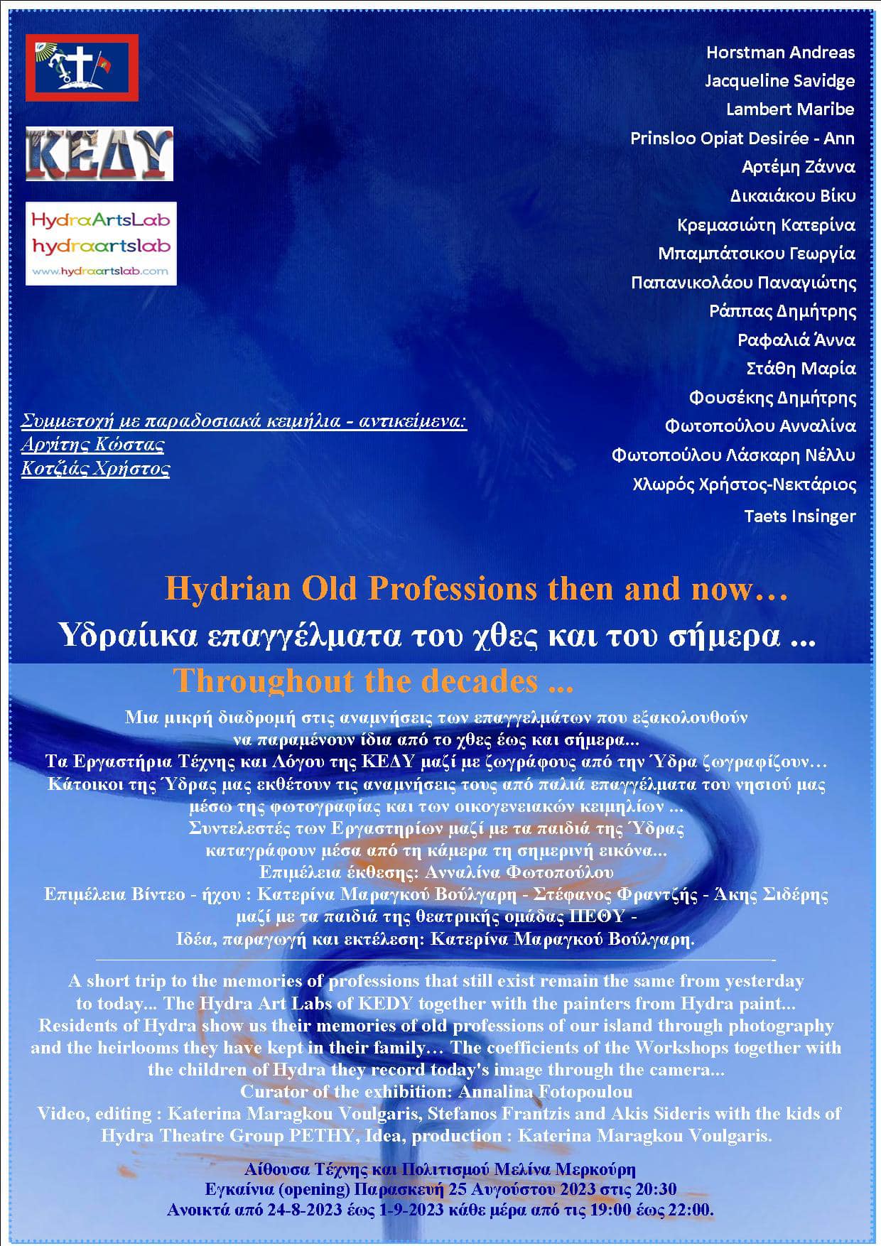 Στο πλαίσιο του εορτασμού "ΚΟΥΝΤΟΥΡΙΩΤΕΙΑ 2023" η Κοινωφελής Επιχείρηση του Δήμου Ύδρας πραγματοποιεί σήμερα Παρασκευή 25 Αυγούστου στις 20:30, Ομαδική έκθεση (ζωγραφικής, φωτογραφίας παλιών αντικειμένων) με θέμα "Υδραίικα Επαγγέλματα. Του χθες και του σήμερα", στη δημοτική αίθουσα Μελίνα Μερκούρη.