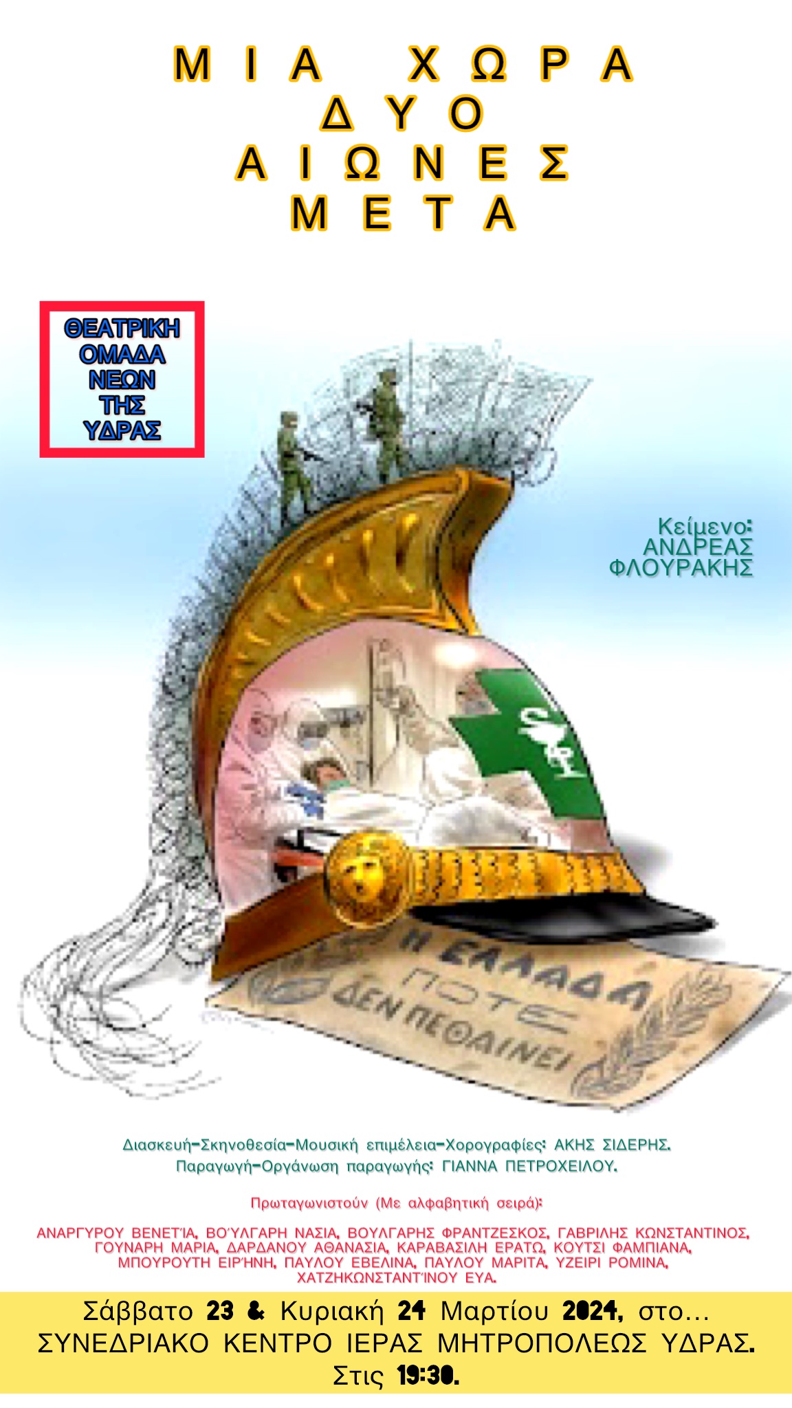 Ημερομηνία διεξαγωγής παράστασης: 23 & 24 Μαρτίου 2024 στις 19:30 στο Συνεδριακό Κέντρο του Ιερού Καθεδρικού Ναού Ύδρας (Μητρόπολη).