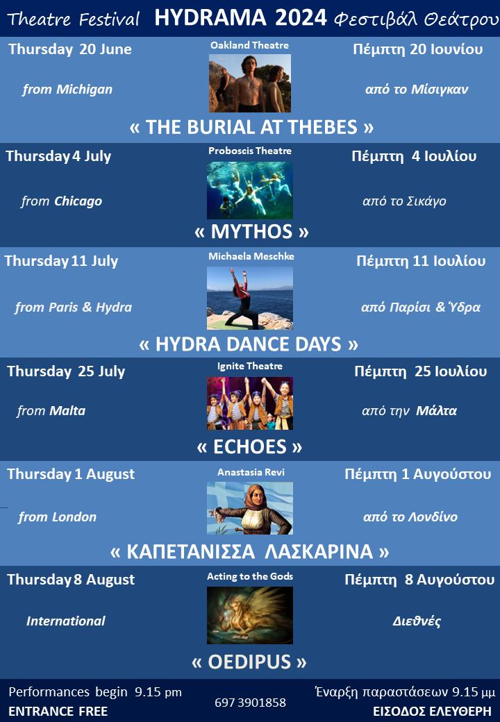 Thursday August 8th: “OEDIPUS” – Sophocles’ play, (and more), with a multi-national cast of actors from countries including India, Holland, Italy, Ireland, England, Canada and the USA. Directed by Kostas Gakis.