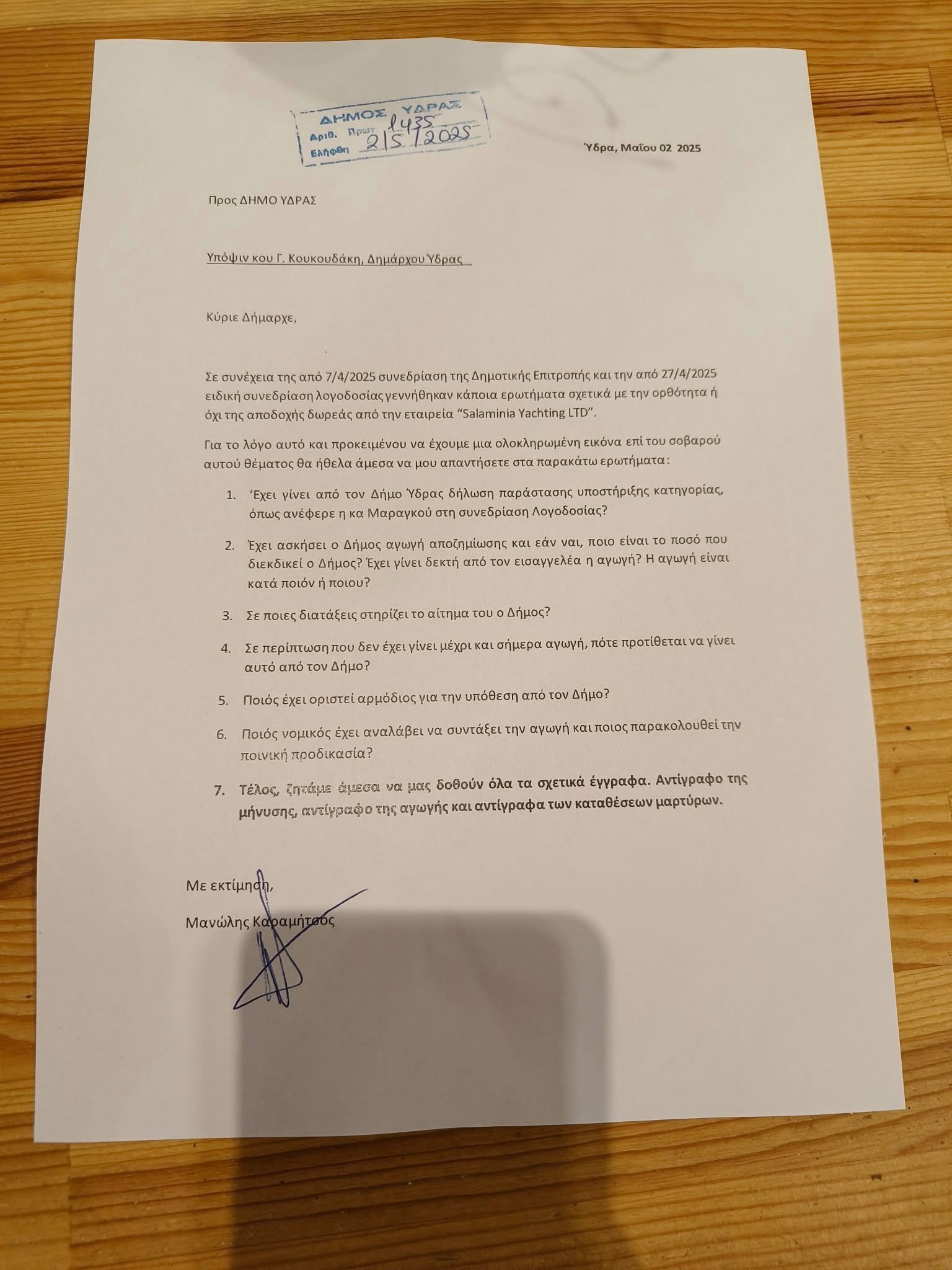 Ο επικεφαλής της δημοτικής παράταξης "Μέλλον της Ύδρας", Μανώλης Καραμήτσος αναφέρεται στην παρακάτω ενημέρωση για τη δωρεά της εταιρείας SalaminiaYachting LTD στον Δήμο Ύδρας, που έχει γίνει θέμα των τελευταίων ημερών.