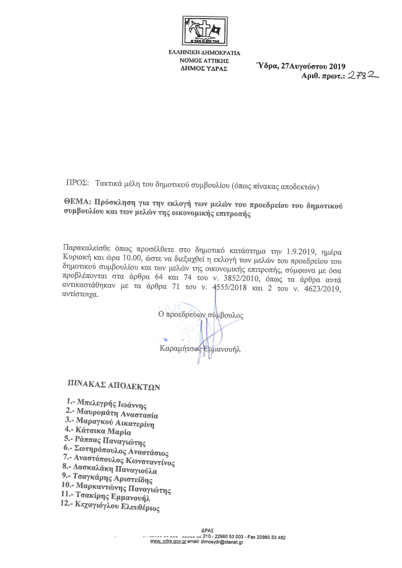 Εκλογή των μελών του προεδρείου του δημοτικού συμβουλίου και των μελών της οικονομικής επιτροπής του Δ. Ύδρας