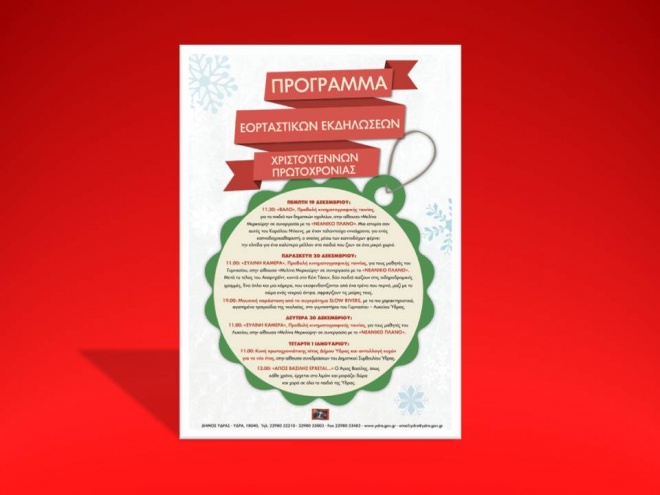 Τα Χριστούγεννα η αγαπημένη γιορτή μικρών και μεγάλων αλλά και η Πρωτοχρονιά αναμένεται να εορταστούν φέτος με ένα πολύ όμορφο πρόγραμμα εορταστικών εκδηλώσεων του Δήμου Ύδρας. Με πρωτότυπες κινηματογραφικές ταινίες για παιδιά του Δημοτικού αλλά και για τους νέους του Γυμνασίου και του Λυκείου, καθώς και μουσική παράσταση με σύγχρονα τραγούδια που αγαπάει η νεολαία μας. Επίσης με την καθιερωμένη κοπή της Πρωτοχρονιάτικης πίτας στην αίθουσα συνεδριάσεων του Δημοτικού Συμβουλίου, αλλά και με τον Άγιο Βασίλη που θα μοιράσει και φέτος την Πρωτοχρονιά υπέροχα δώρα για τα παιδιά στο λιμάνι μας. Οι εκδηλώσεις αυτές θα ζωντανέψουν ευχάριστα τις μέρες της κάθε ηλικίας των αγαπημένων μας προσώπων, μια και όλοι, έχουμε ανάγκη μεγάλη τη χαρά των Χριστουγέννων!