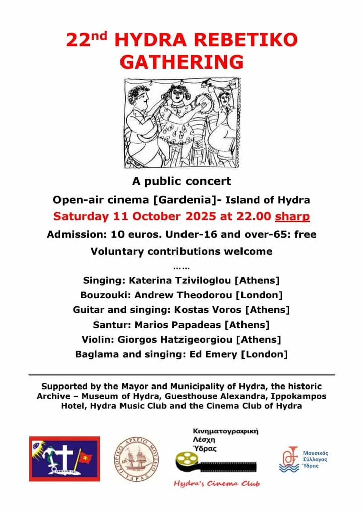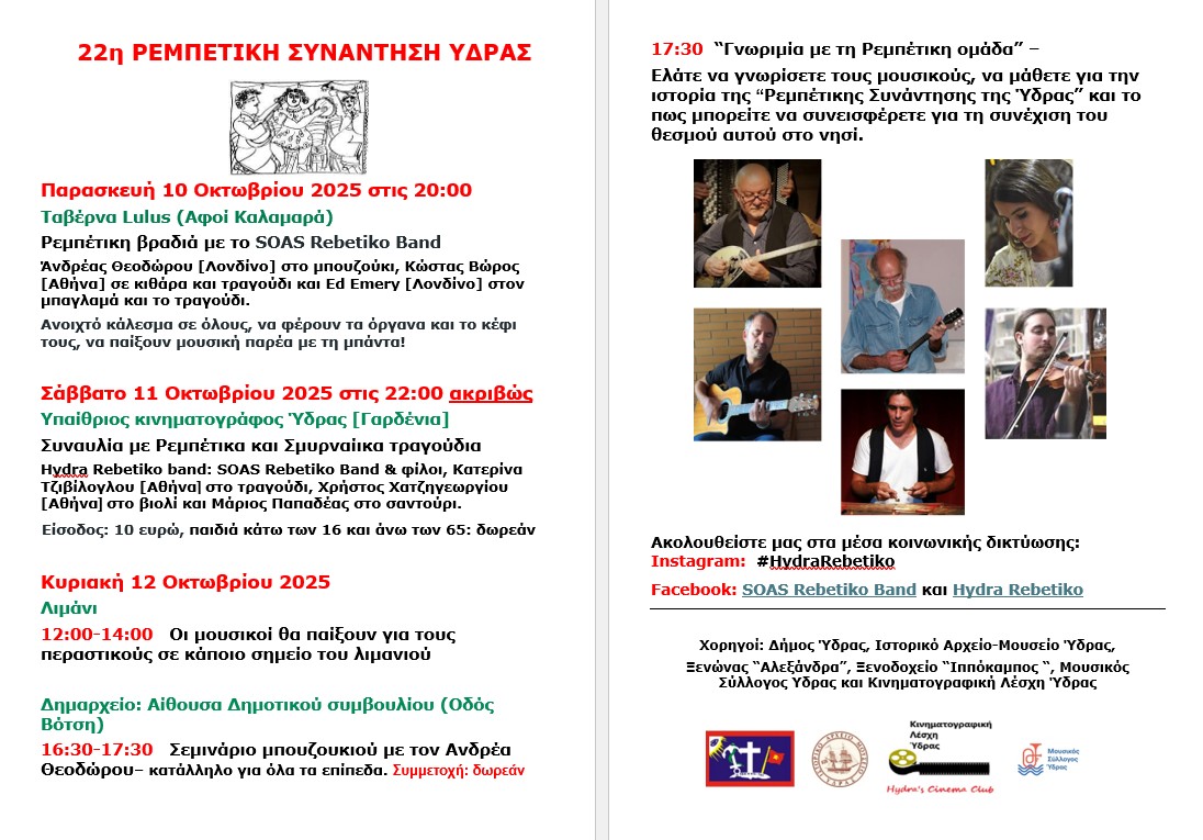 Σημαντική στιγμή του φεστιβάλ θα είναι η συναυλία της SOAS Rebetiko Band το Σάββατο 11 Οκτωβρίου στον κινηματογράφο της Ύδρας (Σινε-Γαρδένια) στις 10:00, με μουσικούς από την Αθήνα και το Λονδίνο.