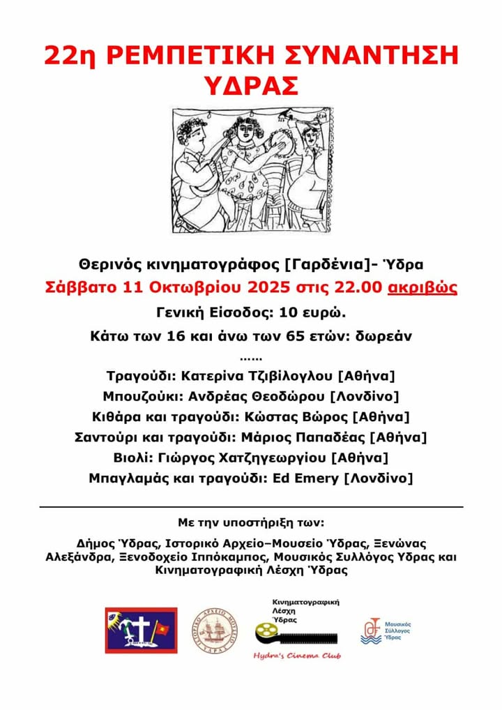 Η φετινή, 22η Συνάντηση Ρεμπέτικου θα πραγματοποιηθεί από την Πέμπτη 10 Οκτωβρίου έως την Κυριακή 12 Οκτωβρίου 2025.