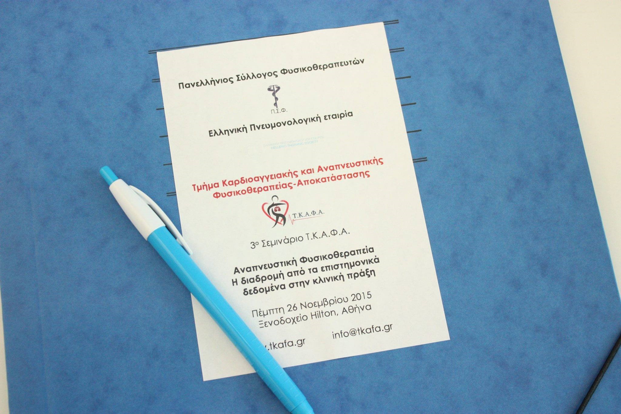 Ολοκληρώθηκε με πολύ μεγάλη επιτυχία το 3ο Σεμινάριο του Τμήματος Καρδιοαγγειακής και Αναπνευστικής Φυσικοθεραπείας-Αποκατάστασης (Τ.Κ.Α.Φ.Α.) του Πανελληνίου Συλλόγου Φυσικοθεραπευτών (Π.Σ.Φ.) με τίτλο «Αναπνευστική Φυσικοθεραπεία-Η διαδρομή από τα επιστημονικά δεδομένα στην κλινική πράξη» στα πλαίσια του 24ου Πανελληνίου Πνευμονολογικού Συνεδρίου, την Πέμπτη 26 Νοεμβρίου στο Hilton, Αθήνα. Το Σεμινάριο παρακολούθησαν 186 συμμετέχοντες από όλη την Ελλάδα.