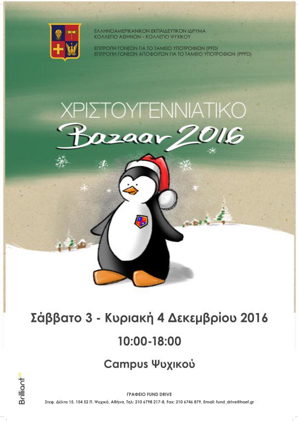 Το χριστουγεννιάτικο Bazaar διοργανώνουν οι Επιτροπές Γονέων και Γονέων Αποφοίτων για την ενίσχυση του Ταμείου Υποτροφιών Κολλεγίου Αθηνών - Κολλεγίου Ψυχικού. Πρόκειται για μία από τις πιο σημαντικές εκδηλώσεις των επιτροπών -οι οποίες λειτουργούν αποκλειστικά σε εθελοντική βάση- και αποτελεί παράδοση για το Κολλέγιο.