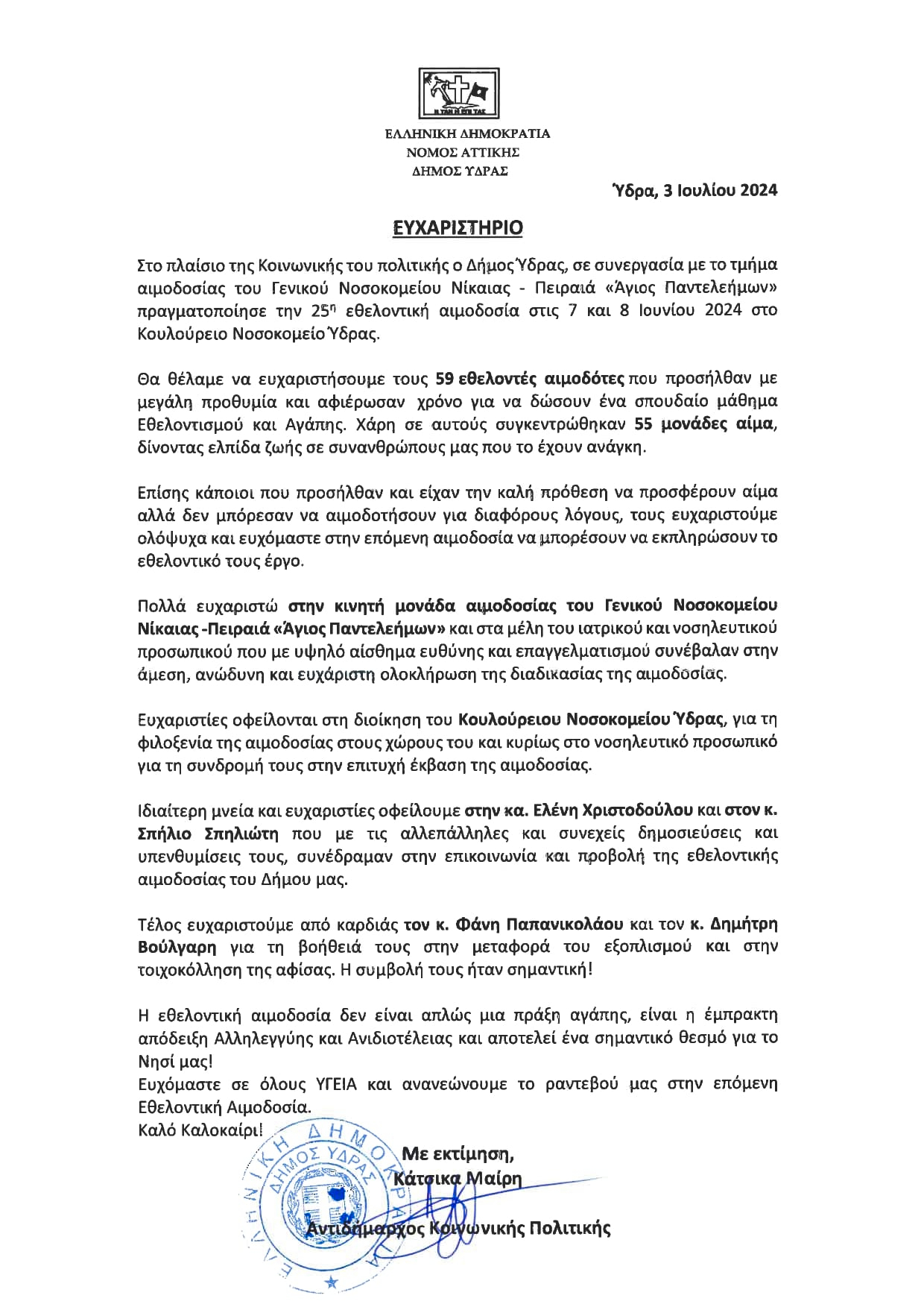 Ευχαριστήριο της Αντιδημάρχου Ύδρας Μαίρης Κάτσικα για όσους συμμετείχαν στην Εθελοντική Αιμοδοσία